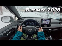 - A first-person perspective (POV) video documents a blizzard drive from New York to Boston in a Toyota RAV4 Prime PHEV, emphasizing the real-time challenges of navigating deep snow and icy roads.
