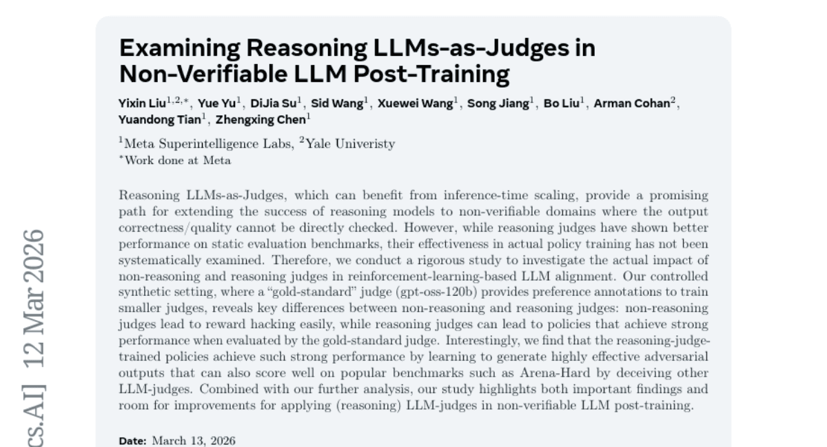 A significant recent breakthrough involves **leveraging LLMs as judges in post-training evaluation**. Traditionally, model assessments rely on human annotators or automated metrics that may not fully grasp nuanced reasoning or domain-specific criteria. The paper *"Examining Reasoning LLMs-as-Judges in Non-Verifiable LLM Post-Training"* explores how LLMs themselves can serve as **scalable, context-aware evaluators** of other models’ outputs, particularly in complex reasoning tasks where verifiability is limited. This approach raises critical questions about **trustworthiness, bias, and consistency** in AI evaluation systems.