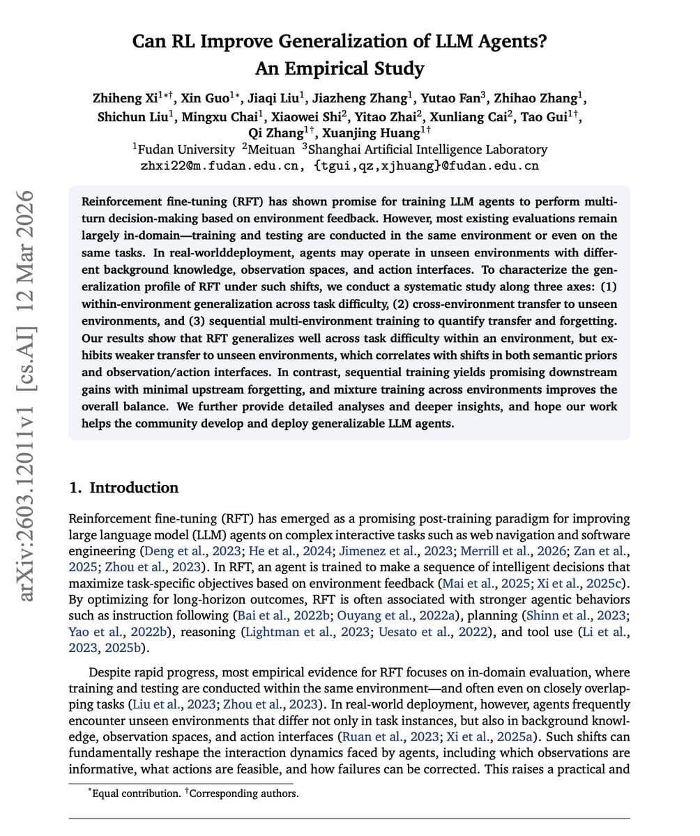 - **Research on LLM Agent Generalization**: Studies such as those summarized by @omarsar0 and @dair_ai explore how **reinforcement learning (RL) fine-tuning** enhances the **generalization capabilities of LLM agents**, making them more adaptable across tasks and domains—a crucial step toward **robust, autonomous AI collaborators**.