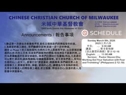 吳榮滁牧師對馬太福音26:17-30的靈修講道,深刻揭示耶穌十架之路的神聖救贖計劃,強調祂在最後晚餐中的順服與堅定。3月15日發布的《世上的光》(馬太5:14)靈修短片,激勵信徒反思如何在社會中成為基督生命的光與鹽。過往對法利賽人批判(23:1-12)與生命教導(20:17-34)的釋經仍是教導重點。 -