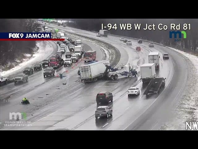 - A **YouTube clip titled "MN weather: Hundreds of crashes during winter storm"** shows **traffic snarled by icy roads and high winds**: