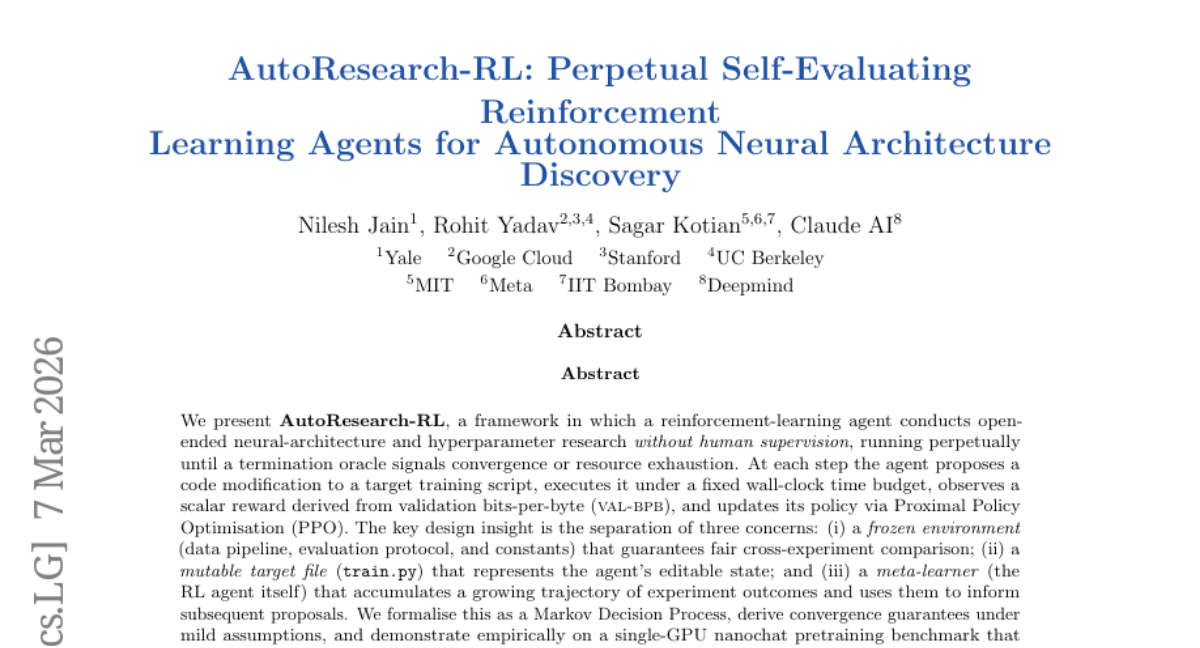 - **Algorithms**: Innovations like **AutoResearch-RL** facilitate **perpetual neural architecture discovery**, and **population-based self-play** fosters **diverse, robust behaviors**.