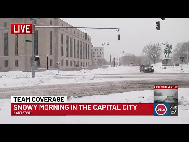 - **Waterbury, Connecticut**: Visuals depict **snowdrifts blocking lanes** and **vehicles stranded**, illustrating continued mobility challenges.