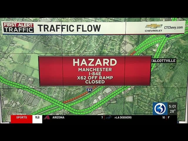 - **Part of I-84 and I-384 in Manchester** remains **closed** following serious crashes, with recent footage depicting blocked lanes and stranded vehicles.